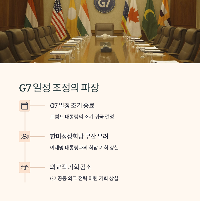트럼프 대통령은 G7 정상회의가 열리고 있는 캐나다에서 조기 귀국을 결정했습니다. 이는 이란-이스라엘 충돌의 파급력이 얼마나 심각한지를 보여주는 장면 중 하나예요. 특히 한국의 이재명 대통령과 예정되어 있던 한미정상회담이 무산될 가능성이 높아지면서 외교적 기회도 줄어들게 되었죠.